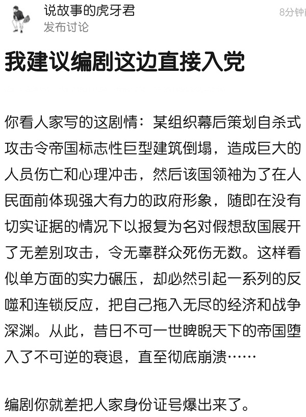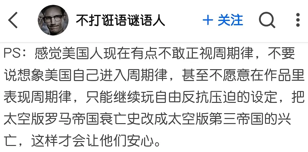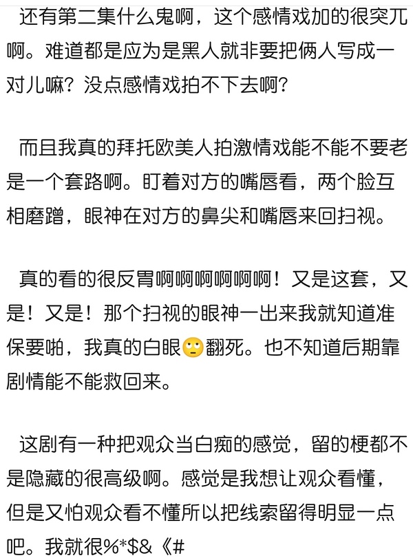 现有李伯儒流媒体影视对于“坏大统领蒙蔽愚民,主角团揭穿坏大统领的阴谋后,被蒙蔽的黔首猛然开眼”这样的愚蠢套路有着蜜汁执念,改坏基地反而是意料之中的事情。但有多少人是从这个方向抨击这剧的呢,我小暂且蒙在铺天盖地的对PC、白左、黑人的谩骂里.....