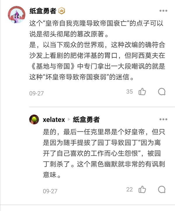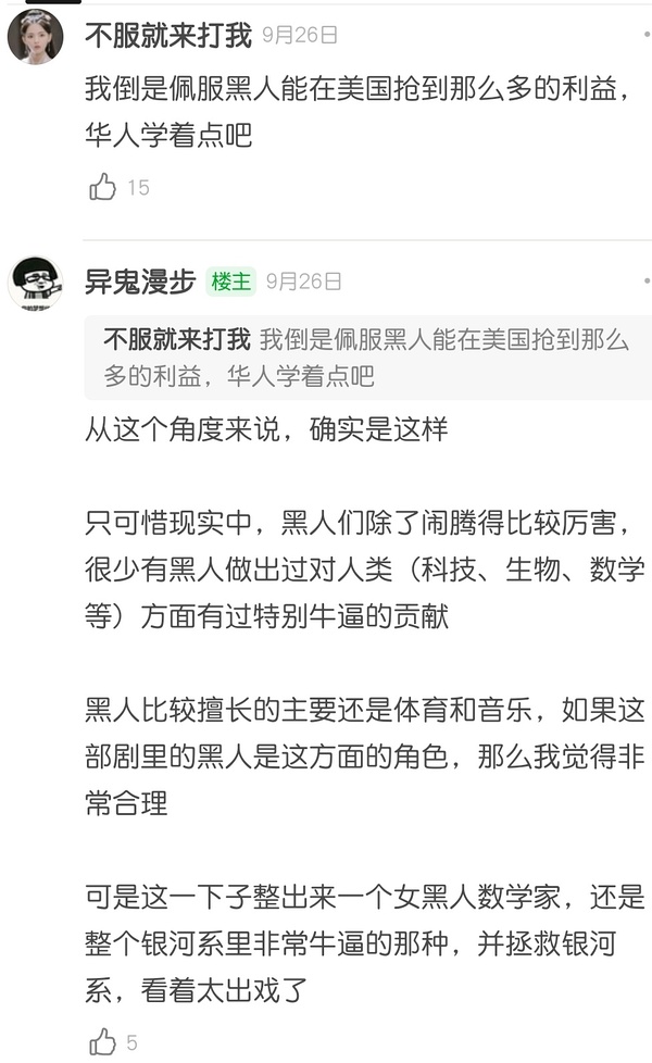剧版这种很难说不是翻冻意识形态的改编已经够谔谔的了(我看剧版可不敢说清楚帝国这种费拉不堪的状态是怎么对屁民分而治之的),另类右的垃圾话更是很难不让人愤怒,让阿西莫夫超时空抄袭刘电工就算了,连黑人女当个数学家都不允许了,张嘴闭嘴都是人类,人类中心主义本质是哪些“人类”的中心已经不言而喻了。