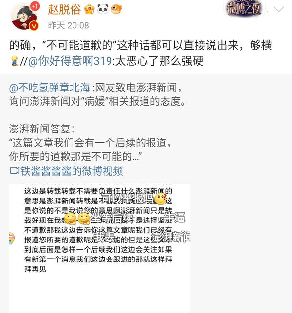 结合澎湃拒不道歉的态度,以及菌怔平账号(该账号由菌韦怔制部掌管)措辞的严厉,恐怕是的。