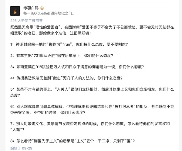 今个随机推送了和田光司的歌,想起几年前colg论坛(DNF的一个论坛)在和田光司死讯传出来的那天狂刷“光叔,一路走好!”屠版,管理员带头刷。感觉挺分裂的,现实中遇到过农叉子粉红:为啥你总听日语歌你不爱国!而论坛那些玩家却大张旗鼓得为日本acg歌手哀悼。真就是屁股罢了,每个人的屁股坐的都是自己的位置,为自己立场说话