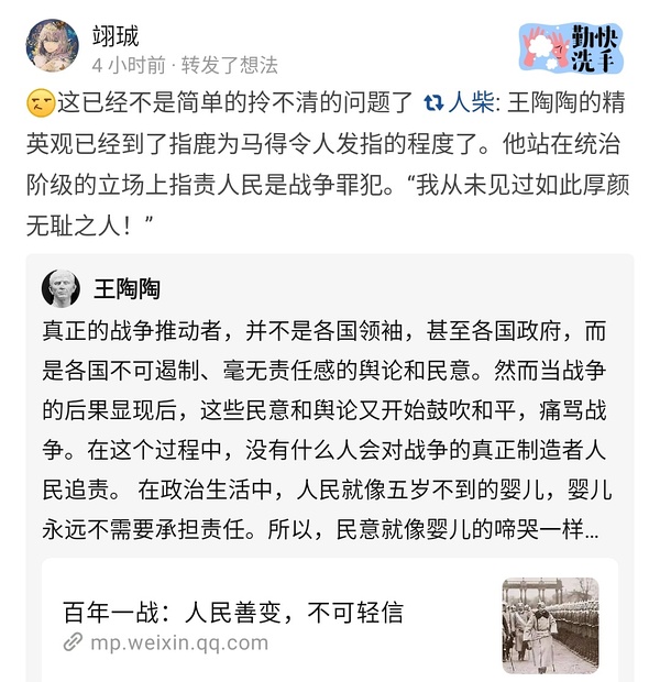 虽然这人极度司马,不过想到二战前存在于德国和日本的社会整体性的对朝鲜人和犹太人的歧视与迫害,与市民阶层的整体性民族主义与战争狂热,就觉得总谢罪和原子弹洗地并不存在什么问题