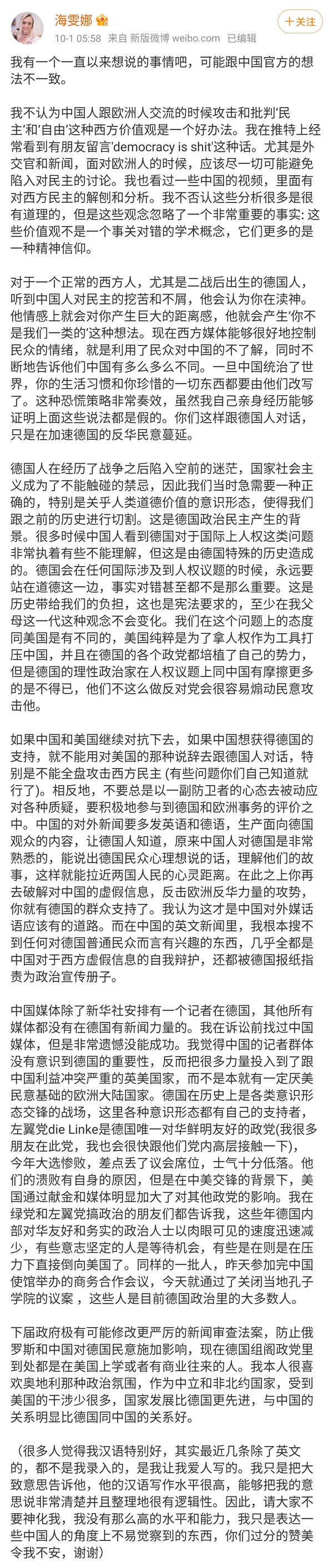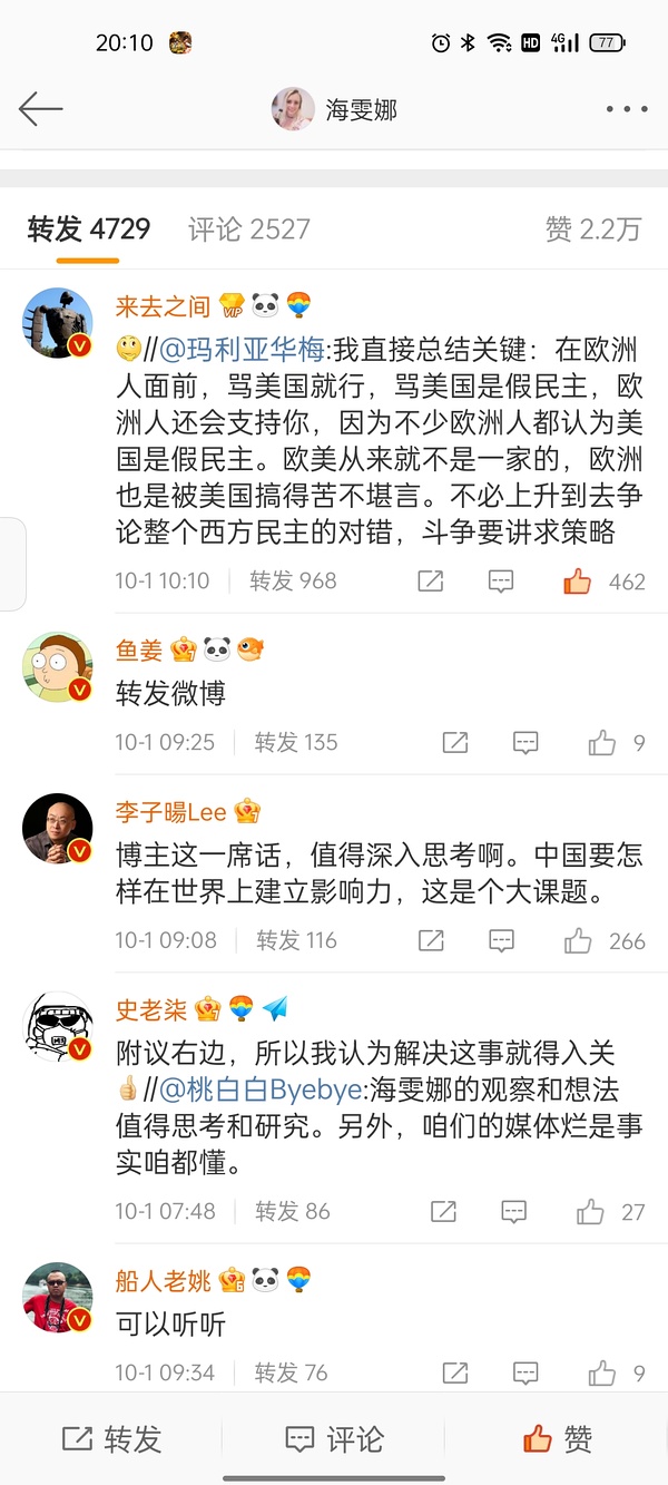 最近盯着骂美国是假民主,应该就是这里面讲的策略,这人的老公家里是PLA背景(她老公本人是做地质科研),不清楚是不是搭上了什么线。