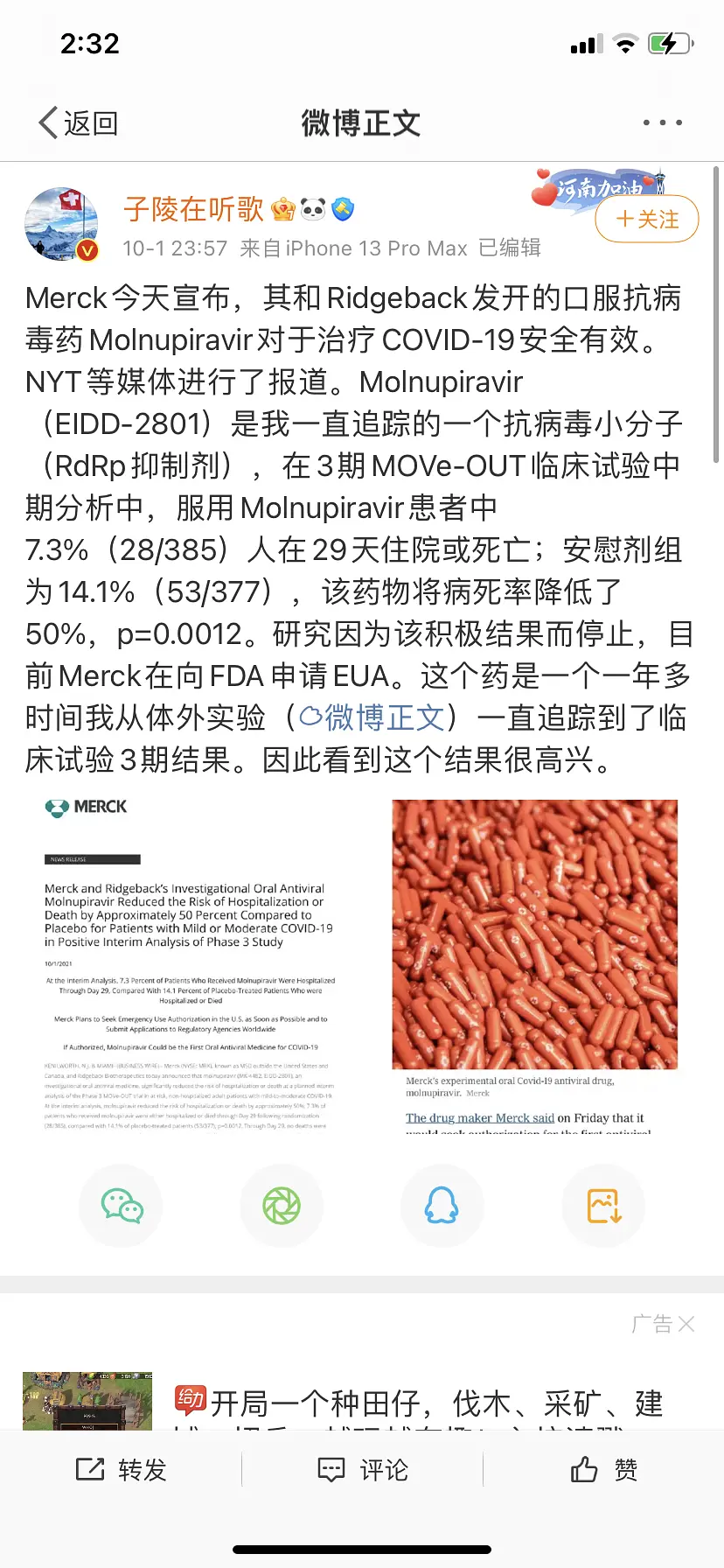 默多克的口服抗罐子哥药成功 能够降低50%的住院/死亡