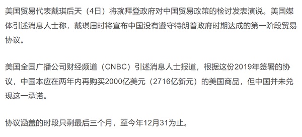 新提速:美将宣布中未遵守第一阶段Trade协议アッカリ~ン2021/10/02 14:23:07 消息人士告诉CNBC,美国贸易代表办公室正在评估可能采取的行动,包括可能的额外关税。 Loading Spinner