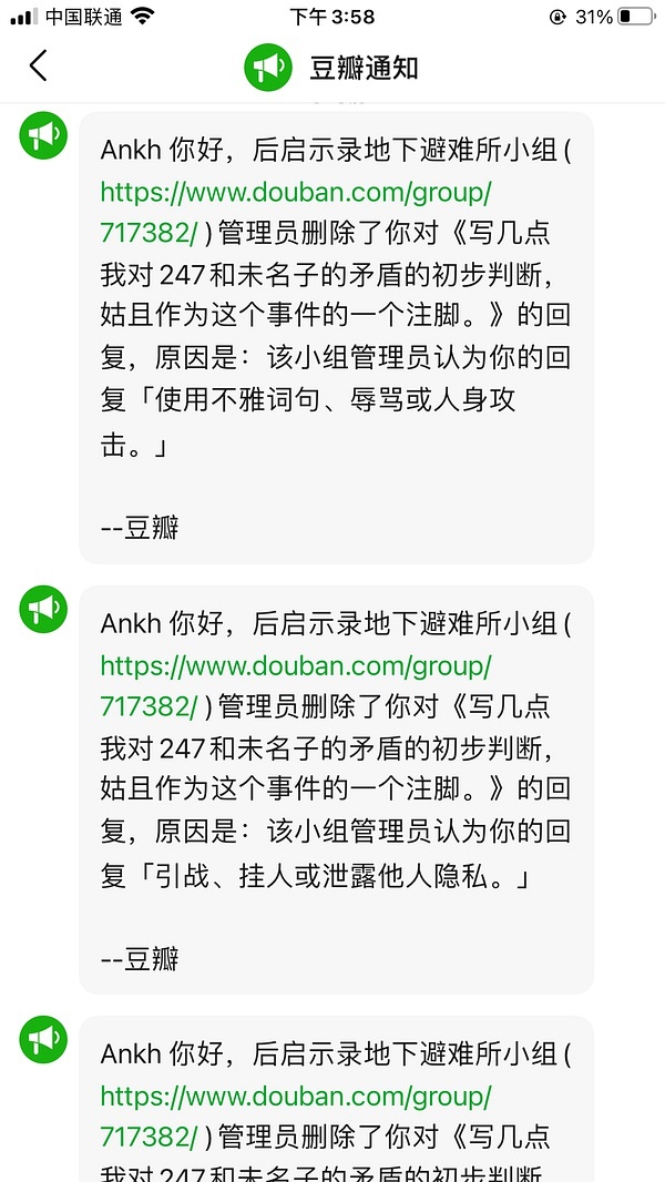 我声明一下:由于这个组的管理员面对我的谣言、污蔑置之不理,但另一方却利用职权之便反复删除我的任意回复。我认为这不仅是对我进行的低劣报复,也是对我人身权益的严重侵犯。
