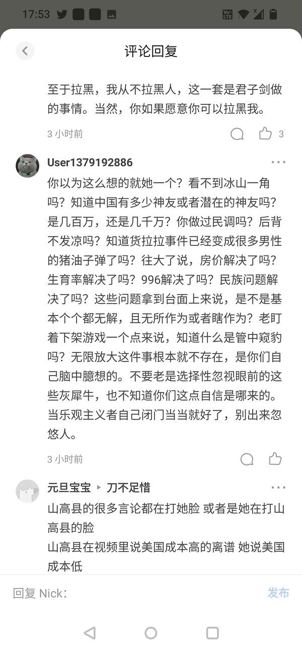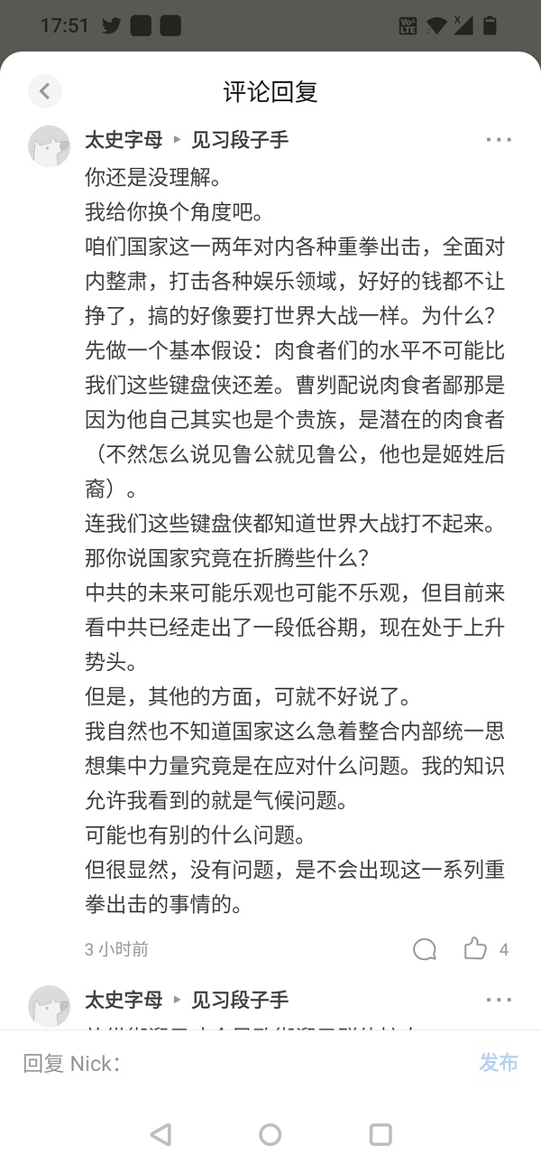 这两派对于文化领域的嗯菜意见观点相差的非常大,再多观察几天甚至可以列表总结对比不同了。后面一派的菟友很多话术越来越像缓则了,以至于在这个文章下面都有菟友公开说“帽子姐身上已经有缓则味”了,哪天野心派皇道派大V被开除菟籍指日可待了。