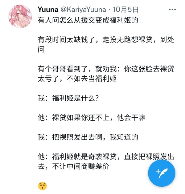 不管是福利姬这种方式还是一些人围观的时候毫不掩饰的高人一等感还是某种不知道从哪挤出来的“同情心”都实在让人遭不太住,虽然后者更加恶心,几乎是看了就赶快划掉的地步