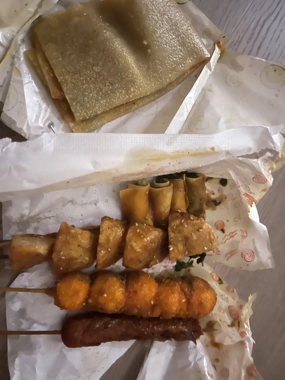 再品味了一下 不酥脆软软的很有韧劲调料较少 吃起来像火锅煮的宽粉还有点死面的大饼..弹弹得