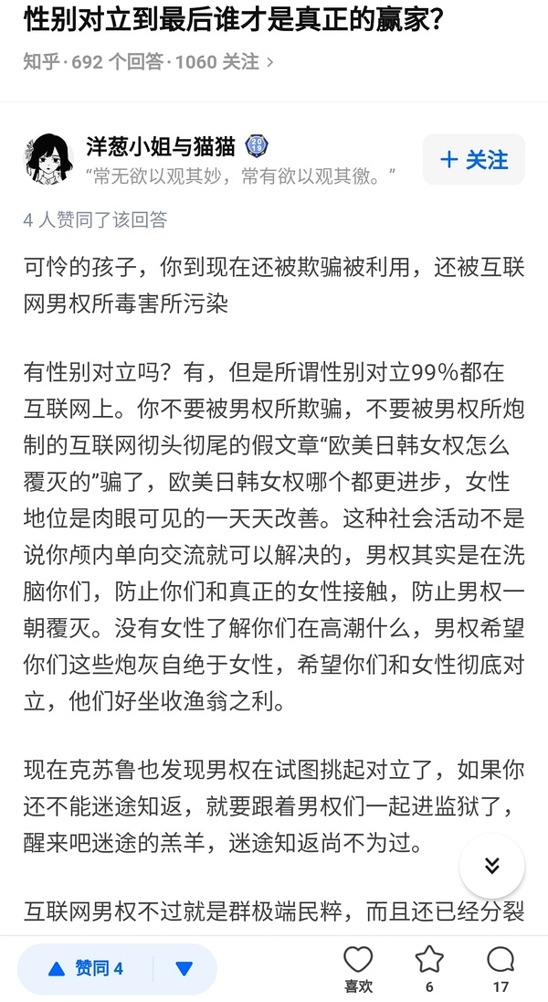 这个话术实际上是逆炼黄涵incel话术:黄涵incel说进步主义是为了精英方便掠夺,这个是说挑起对立是为了能够让chad玩的更多