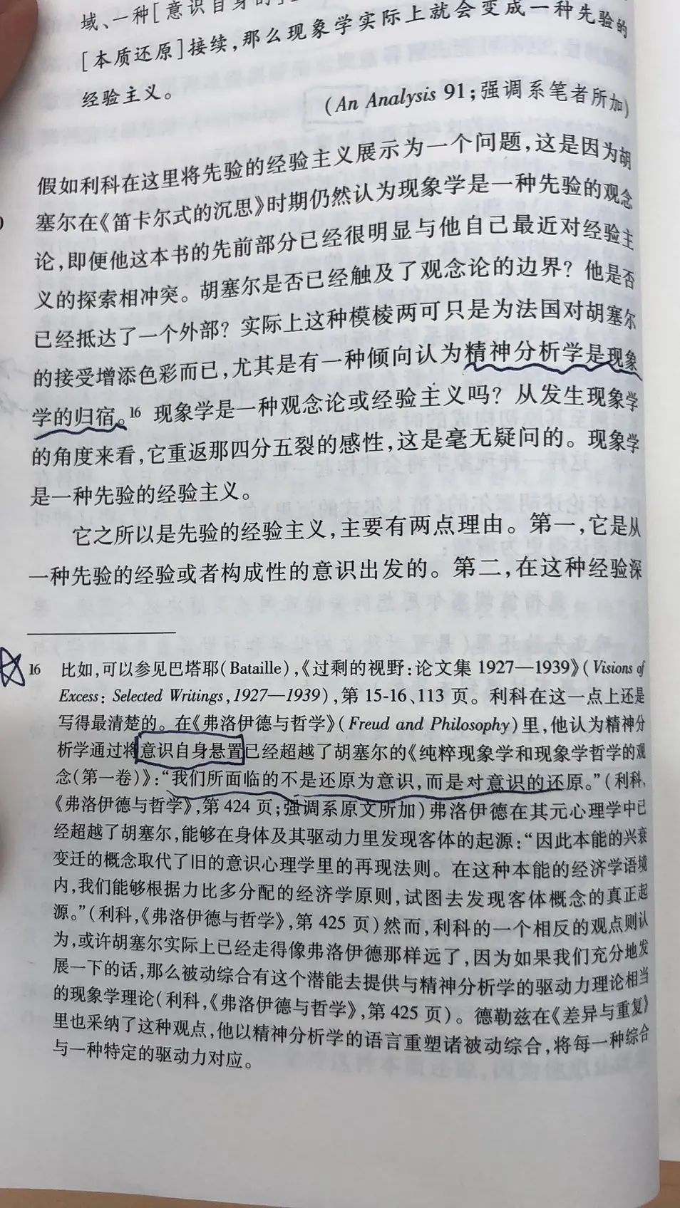德勒兹探求再现的起源,而晚期胡塞尔企图通过先验还原进入现象学还原指向的意向内部,从掌握个别的 被晕圈包围的意向,到掌握意向的感性面之下的一般性,那是否可以说,精神分析是一种内向性的探究?但是精神分析同时又在构造结构,这是我想不明白的:精神分析能算对意向的还原吗?它在指向内部的同时又构建一种话语体系,那么它究竟能不能算做所谓先验经验主义的现象学在面向意向性内部时的继承?