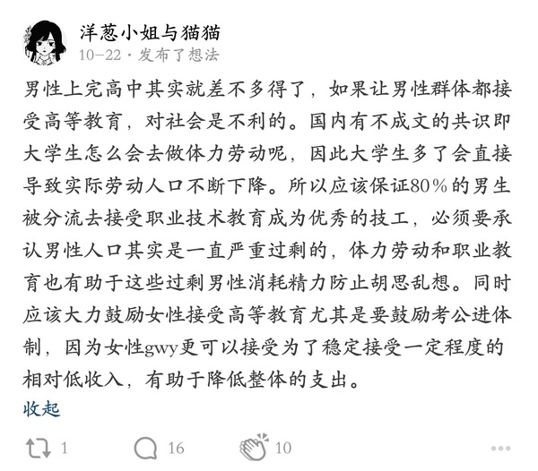 我觉得阿冲人似乎已经失去理解补贴的能力了Khuakhua2021/10/24 12:15:59 Loading...不论是radfem还是黄蝻带学生,都失去了理解争取基本的福利的想象力,连所谓的自己人都需要埋汰和紧缩掉。Loading...Loading... Loading Spinner