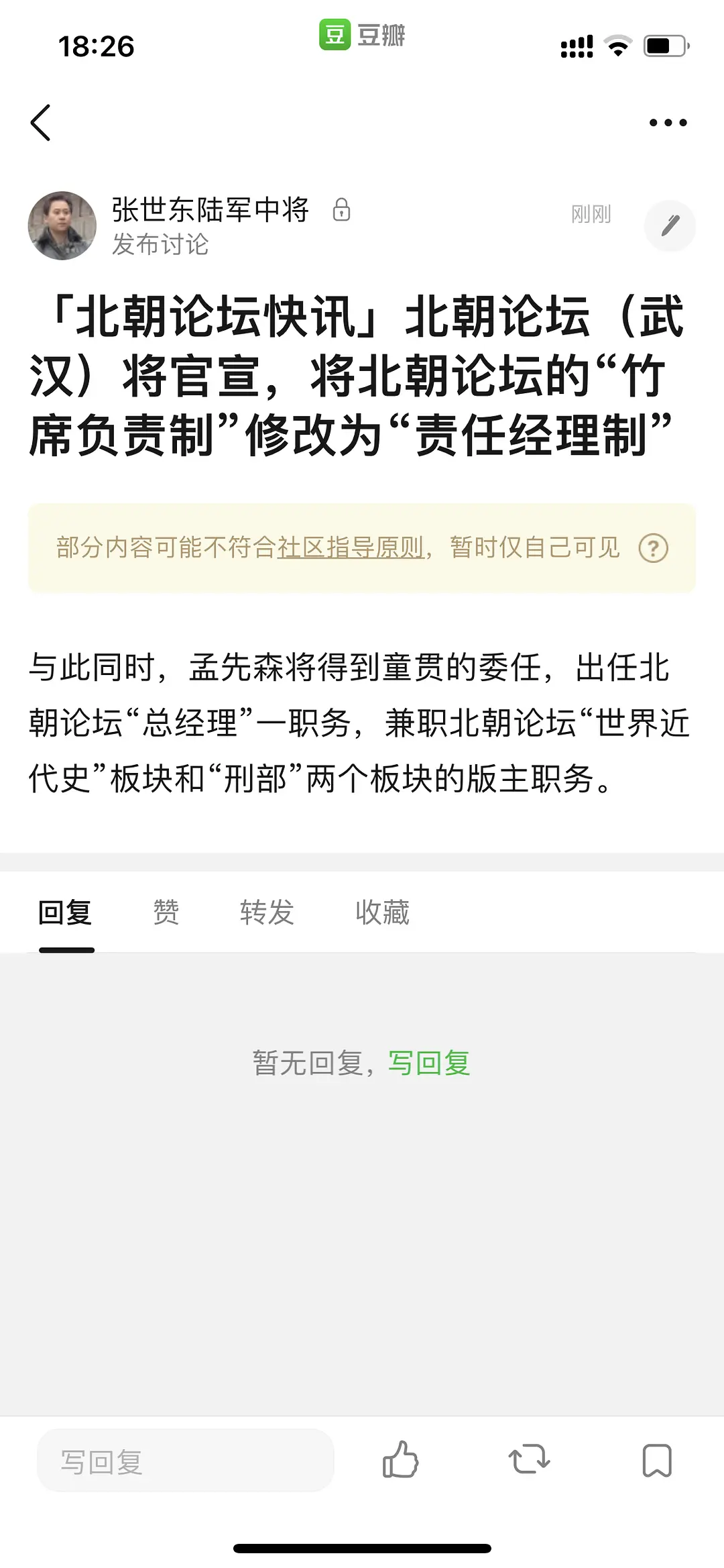 孟先森还将得到一个重要的论坛职务:北朝论坛“长江局”竹席,如果这个操作完成,孟先森的全部职位为:北朝论坛总经理,北朝论坛世界近代史板块版主,北朝论坛“刑部”板块(即北朝论坛会员的违规行为裁定和处理部门)版主,兼北朝论坛“长江局”竹席。