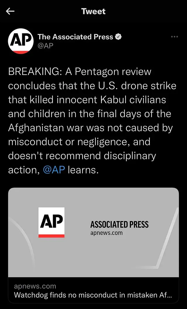 “无人机发动袭击时在通信、识别以及确认轰炸目标的过程中出现了故障,尽管已采取了谨慎措施以防炸死平民,但「错误的袭击」还是发生了。”