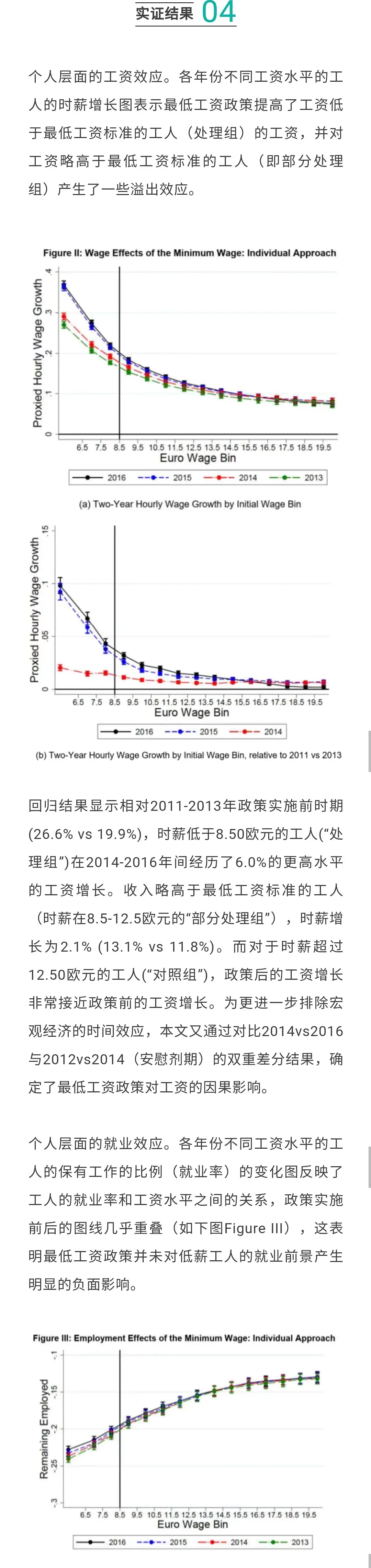 ②个人层面:最低工资政策并未产生负的就业效应,不但没有降低工人们的就业前景,还使一些从事边缘工作或兼职工作的最低工资工人转向了全职工作,如预期那样减少了工资不平等。【最低工资政策使低薪工人被再分配到了日薪高、高技能工人和全职工人比例大、边缘工人比例小的企业中去了】,同时这些企业也拥有更高的企业质量(如:企业规模大、跳槽率低、挖角率高以及高生产率等特征)。