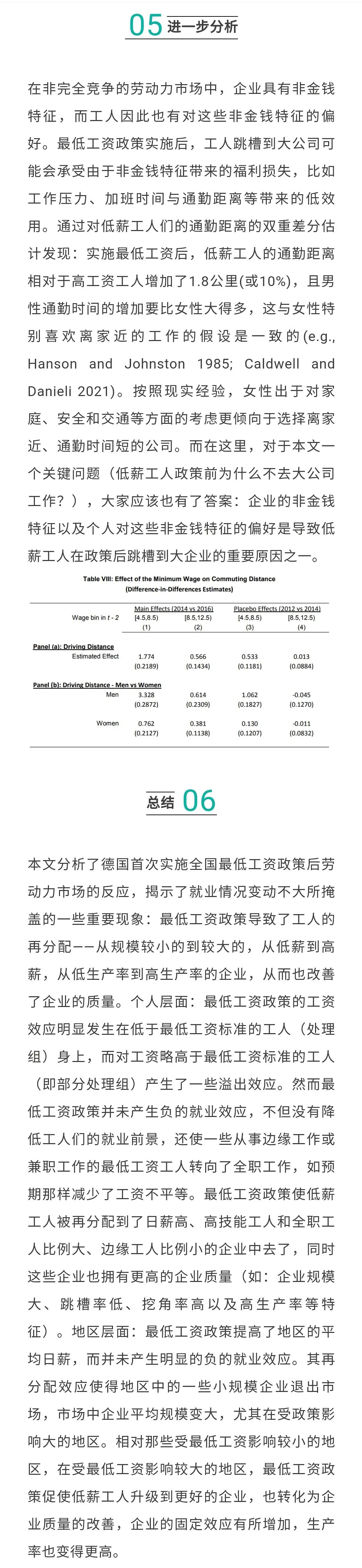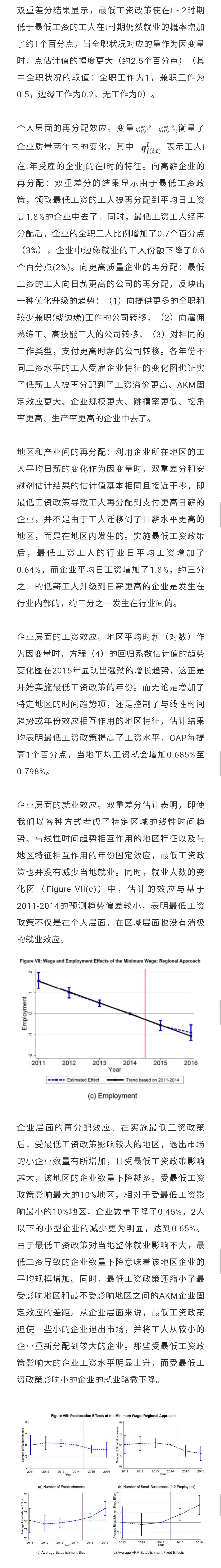③地区层面:最低工资政策提高了地区的平均日薪,而并未产生明显的负的就业效应。【其再分配效应使得地区中的一些小规模企业退出市场,市场中企业平均规模变大】,尤其在受政策影响大的地区。相对那些受最低工资影响较小的地区,在受最低工资影响较大的地区,【最低工资政策促使低薪工人升级到更好的企业,也转化为企业质量的改善,企业的固定效应有所增加,生产率也变得更高】。