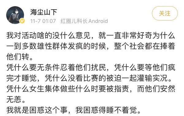 主要是追星的常常被骂“饭圈”“母狗”,但是电竞粉丝明明也很饭圈化却可以逃脱指责