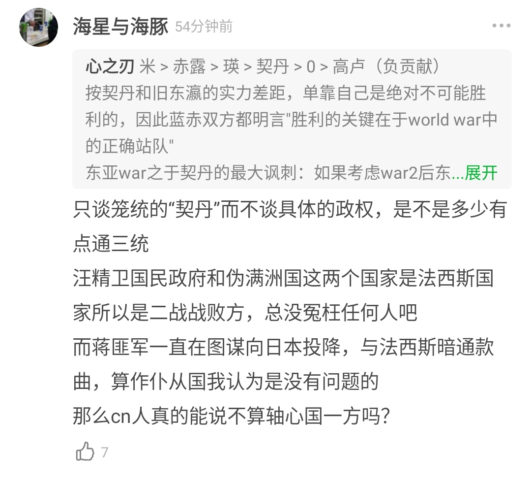 之前翻来覆去讨论过无数遍的「日本人民」定义问题实际上也适用于契丹,按照同样的逻辑,支持汪伪、蒋匪、伪满这三个政权的契丹人尽管在某些时期占绝对多数,但也必然会被开除出「契丹人民」序列。