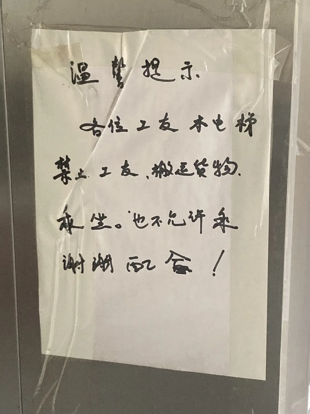学校电梯的告示Boudica2021/11/12 09:39:45 Loading...刚在学校电梯门口拍到。客梯不能运货是没问题的,但不允许工人乘坐又是怎么回事?很想加一句话讽刺一下,写点啥好呢… Loading Spinner