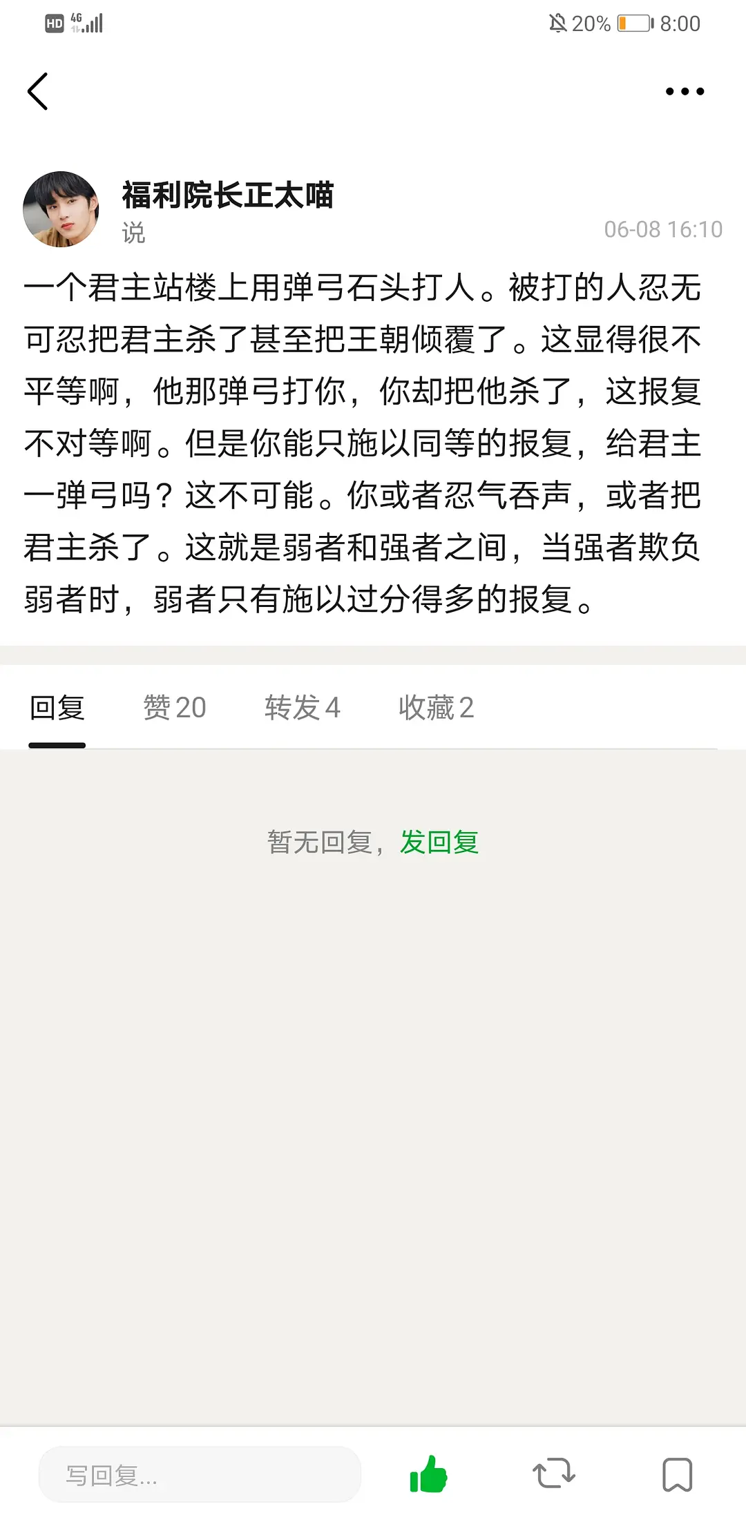 一个自由派豆油解释的矫枉过正的暴力的必要性古都少女千重子2021/11/16 12:06:50 Loading...感觉这种解释确实是目前最能说服我的,我之前对暴力—报复的模型似乎一直是班级暴力式(默认双方可以施加暴力的机会平等)的 Loading Spinner