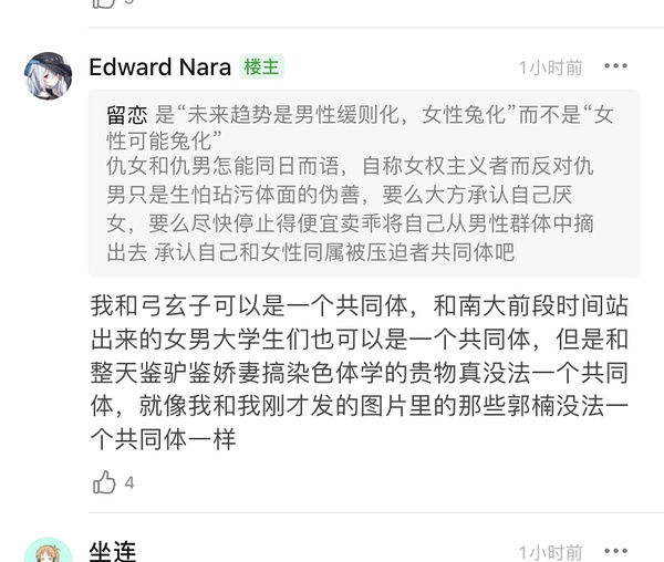我当然支持你使用加了限定语的“郭女”来辱骂一部分人,但你最开始是这个意思吗?你最开始的意思是,想用“郭楠”这个词来给侮辱程度更高的辱女词汇洗地。在我指出这两者侮辱程度不同之后,你就开始胡搅蛮缠。还需要我说的更明白吗?