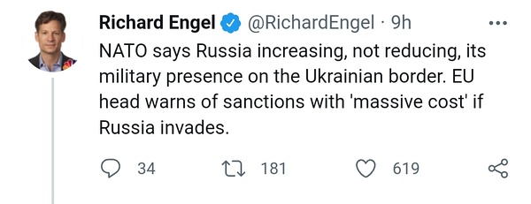 Link Icon Ending of hostilities in the Donbass is possible through political and diplomatic means – Reznikov(Minister of Defense of Ukraine) 乌克兰方面一改之前强硬的态度,怀疑俄罗斯应该是真的发出了战争威胁。