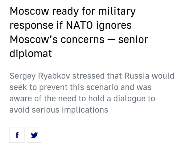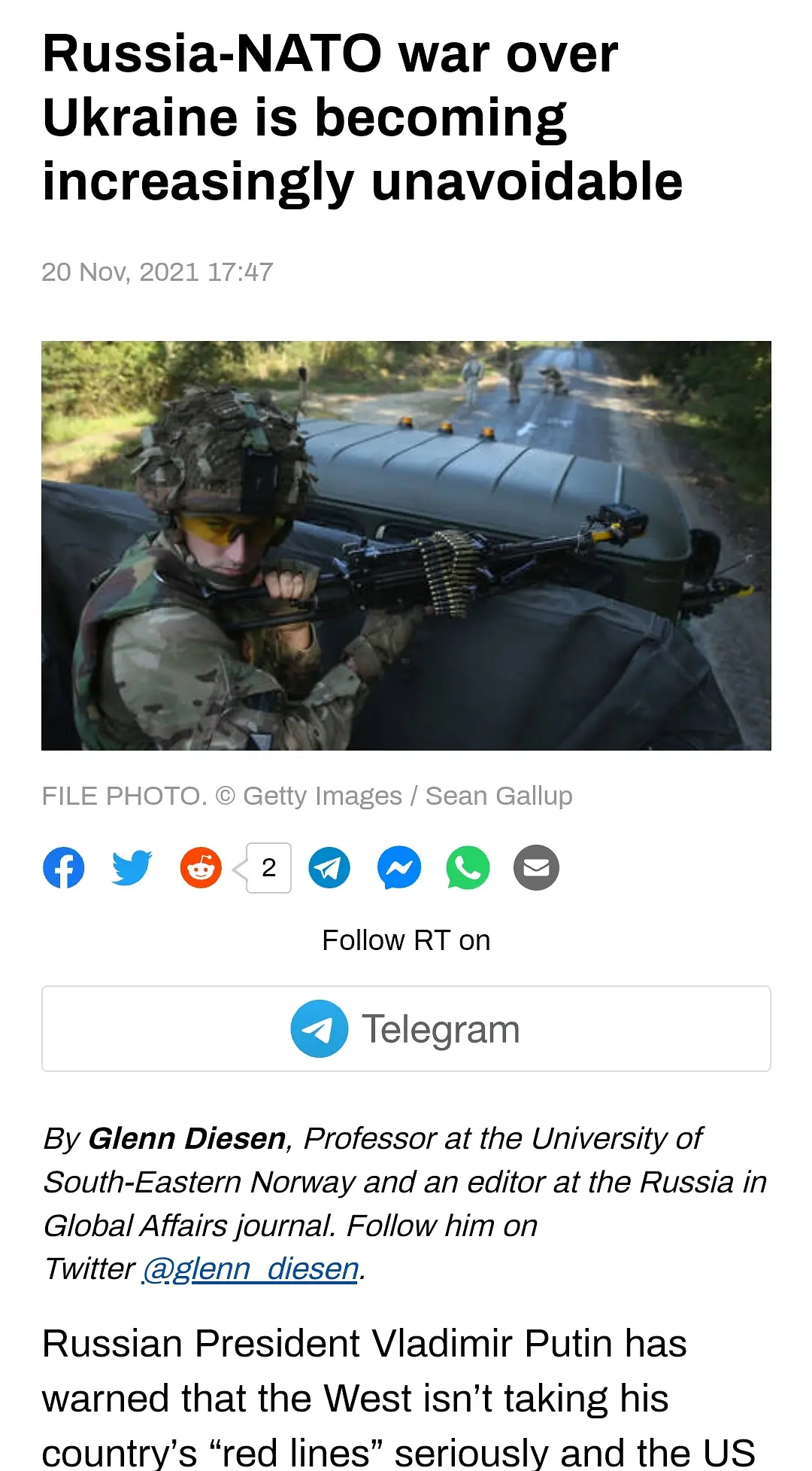 Link Icon The likelihood of a potential Russian assault on Ukraine is “increasing as the weather gets colder,” CBS News reported on Saturday, citing the customary unnamed US intelligence “sources.” Quite why Moscow would choose the coldest months of the year, with the shortest days, is left unclear. “An incursion is weather-dependent, but could happen in a matter of weeks, barring intervention from the West,” it continued. 这不美国佬自己吗?rt日常标题党式转发