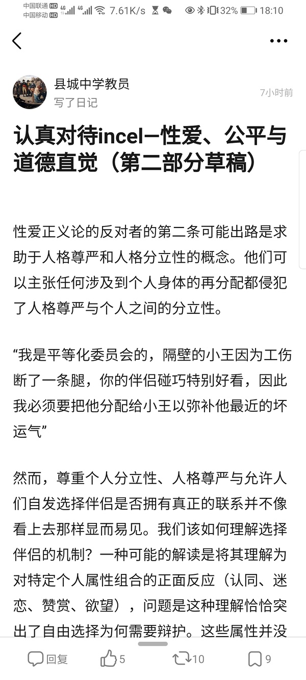 县城中学教员不要混淆视听,我说的不是什么“自由恋爱”“择偶的自由”,而是能够控制自己的全部身体,不至于成为奴隶的“人身自由”。