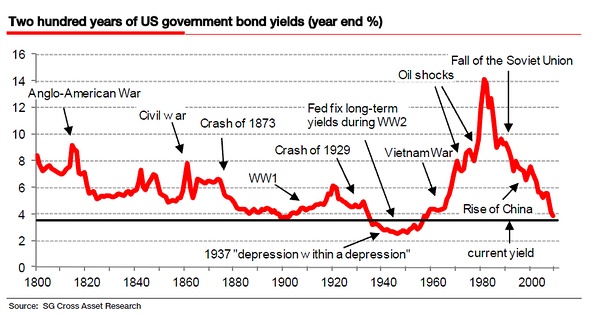 来点超级无聊的历史神学,现在(2021年)美国十年期国债的收益率只有1.5%左右了,显著低于历史平均值(4%左右)。只有一战和二战前收益率这么低。