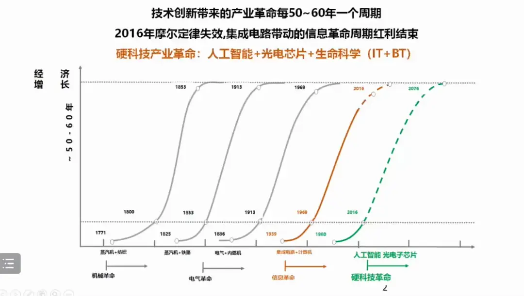 听了一个讲座,开头的示意图感觉挺有道理的。把康波周期(五十到六十年)解释为每次科技创新差不多间隔五十到六十年这样。一次科技创新开始之后八十年,就很难再提供新的经济增长了(计算机发明到现在也快80年了)。