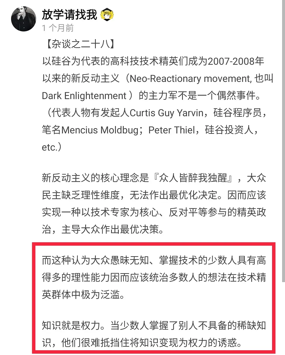 至于流氓中产炮制流氓无产靶子来打的现象,其实在很大程度上和之前组内讨论过的「黑暗启蒙」、「新反动主义」有关。