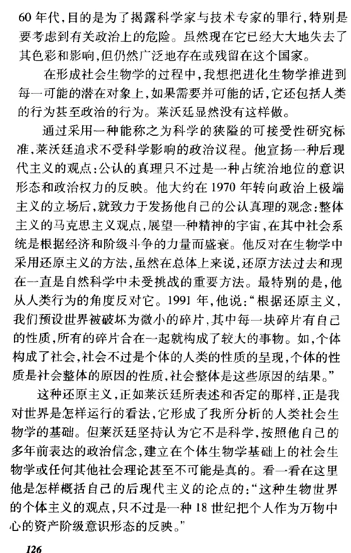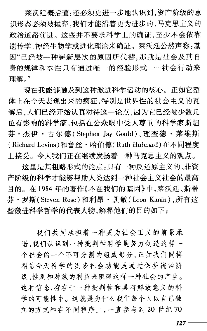 Lewontin 对科学的有时有争议的批评,通常是从马克思主义的角度出发,激发了对科学、政治和社会之间关系的新思考。他直言不讳地批评社会生物学和适应主义(所有特征都随着有机体对其环境的适应而进化)。他鄙视使用生物学来为种族主义意识形态辩护,尤其是在智商测试方面。他与同事斯蒂芬·杰·古尔德 (Stephen Jay Gould) ( Proc. R. Soc. Lond. B. 205 , 581–598; 1979 ) 合着的著名论文“圣马可的拱肩和 Panglossian 范式”尤其强调了“依赖仅以合理性作为接受推测性故事的标准”[.........]在 1960 年代的芝加哥,列万廷在政治上变得越来越活跃,公开反对种族歧视、越南战争和经济不平等。由于其对秘密战争研究的支持,他的强烈信念使他放弃了美国国家科学院的选举。在生态学家 Dick Levins 和福特基金会的支持下,他组建了一个小组来调查资本在农业研究中的作用,例如开发杂交作物。Lewontin 和 Levins 的合作还导致了一系列从马克思主义角度讨论生物学和社会的论文,后来出版为辩证生物学家(1985) 和影响下的生物学(2007)。就像他对社会生物学的批评一样,这些文章中的许多都将科学视为政治,反对还原论和决定论,因为它们倾向于对复杂的生物社会现象进行生物学解释。