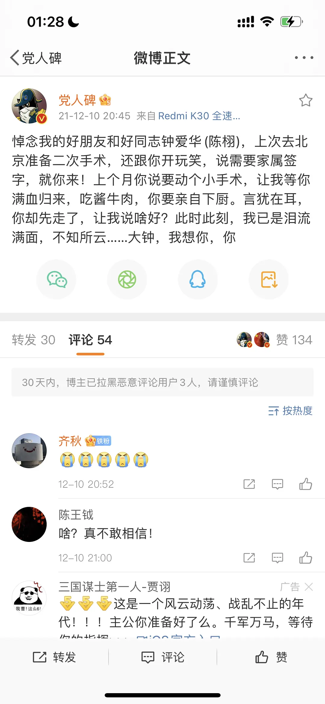 「临时紧急通告」北朝论坛 前内控部门负责人 老兵钟爱华 因病去世仁东张世东2021/12/10 17:30:42 Loading...Loading...本人谨代表本组,出于人道ZY的关怀原则,对钟先森的不幸离世深表哀悼!对钟先森的遗孀和家人表示诚挚慰问! Loading Spinner