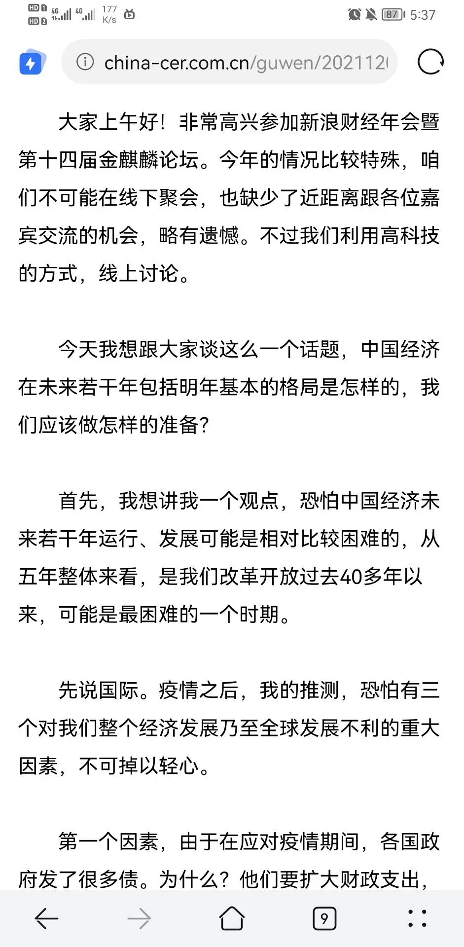 “首先,我想讲我一个观点,恐怕经济未来若干年运行、发展可能是相对比较困难的,从五年整体来看,是我们改革开放过去40多年以来,可能是最困难的一个时期。”