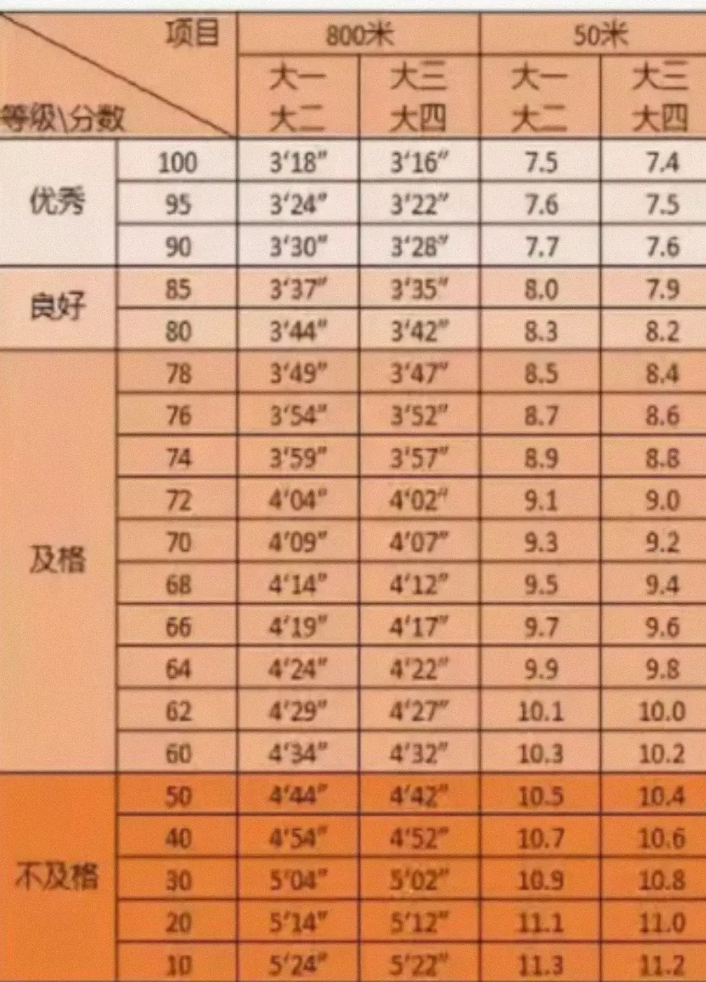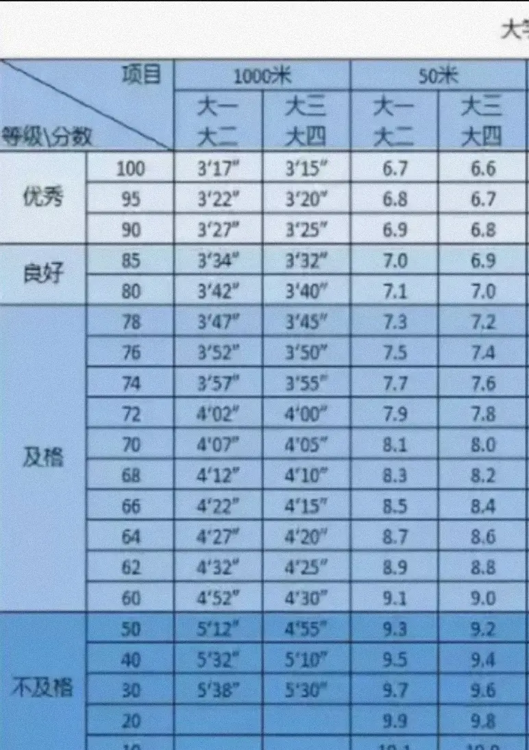 二、高校男女学生的同样项目的体测标准不同: