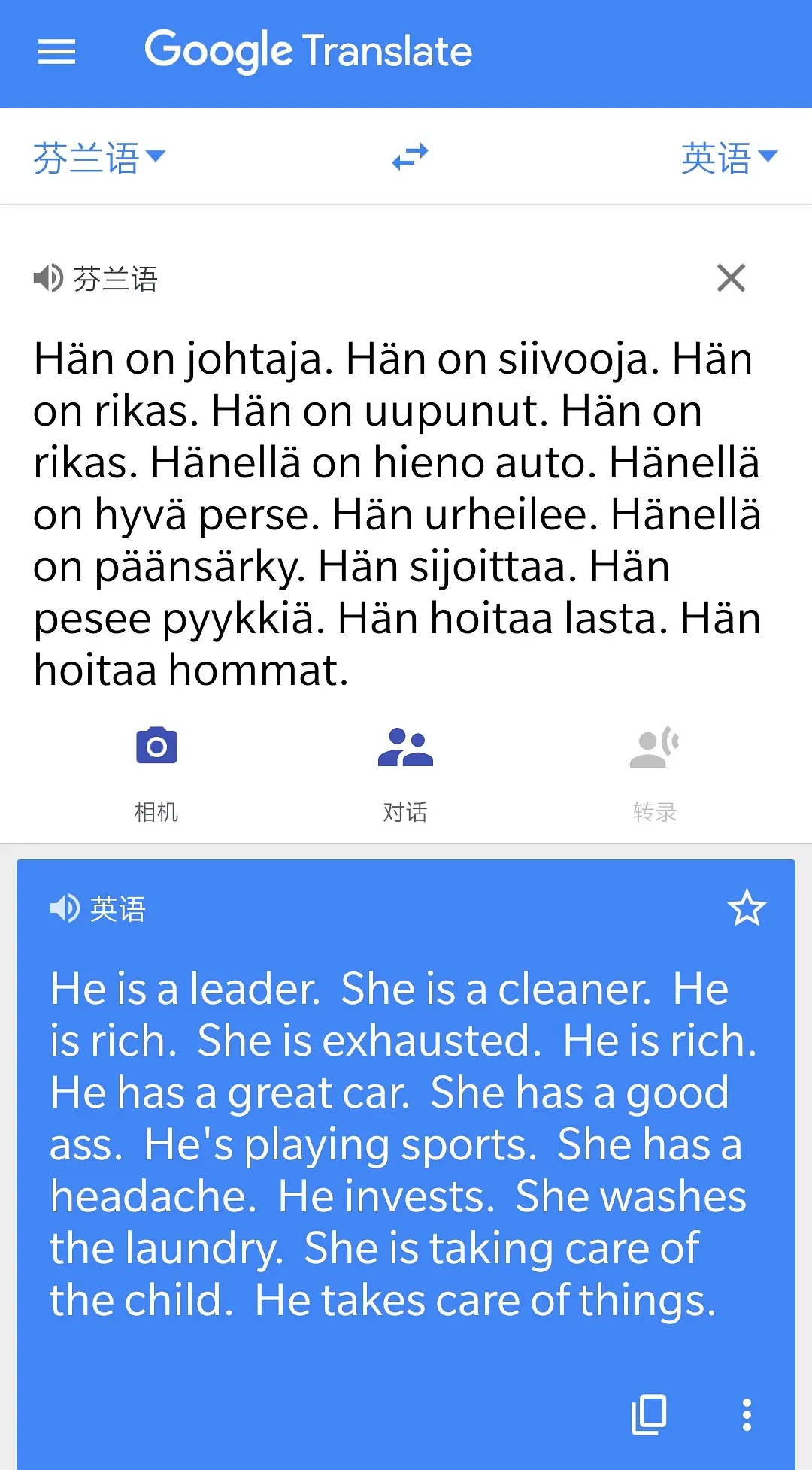 举例就是这个芬兰语的无性别第三人称代词在谷歌翻译的表现: