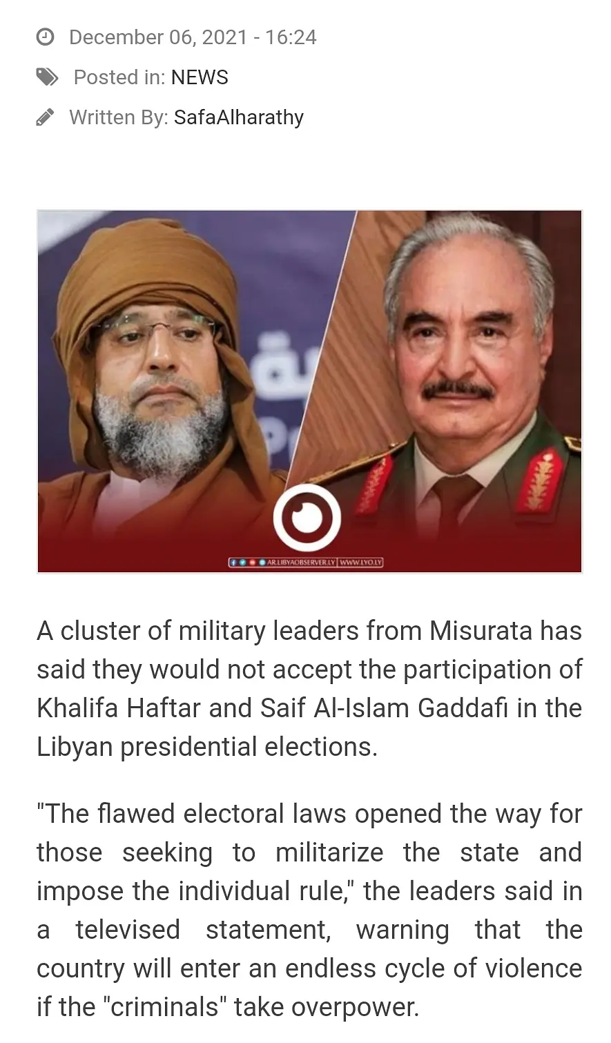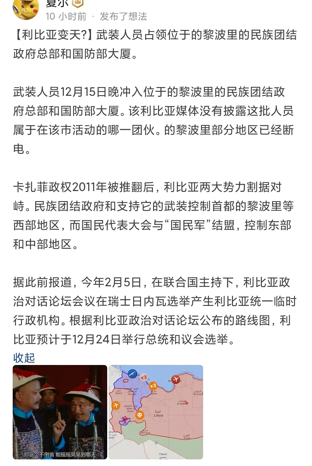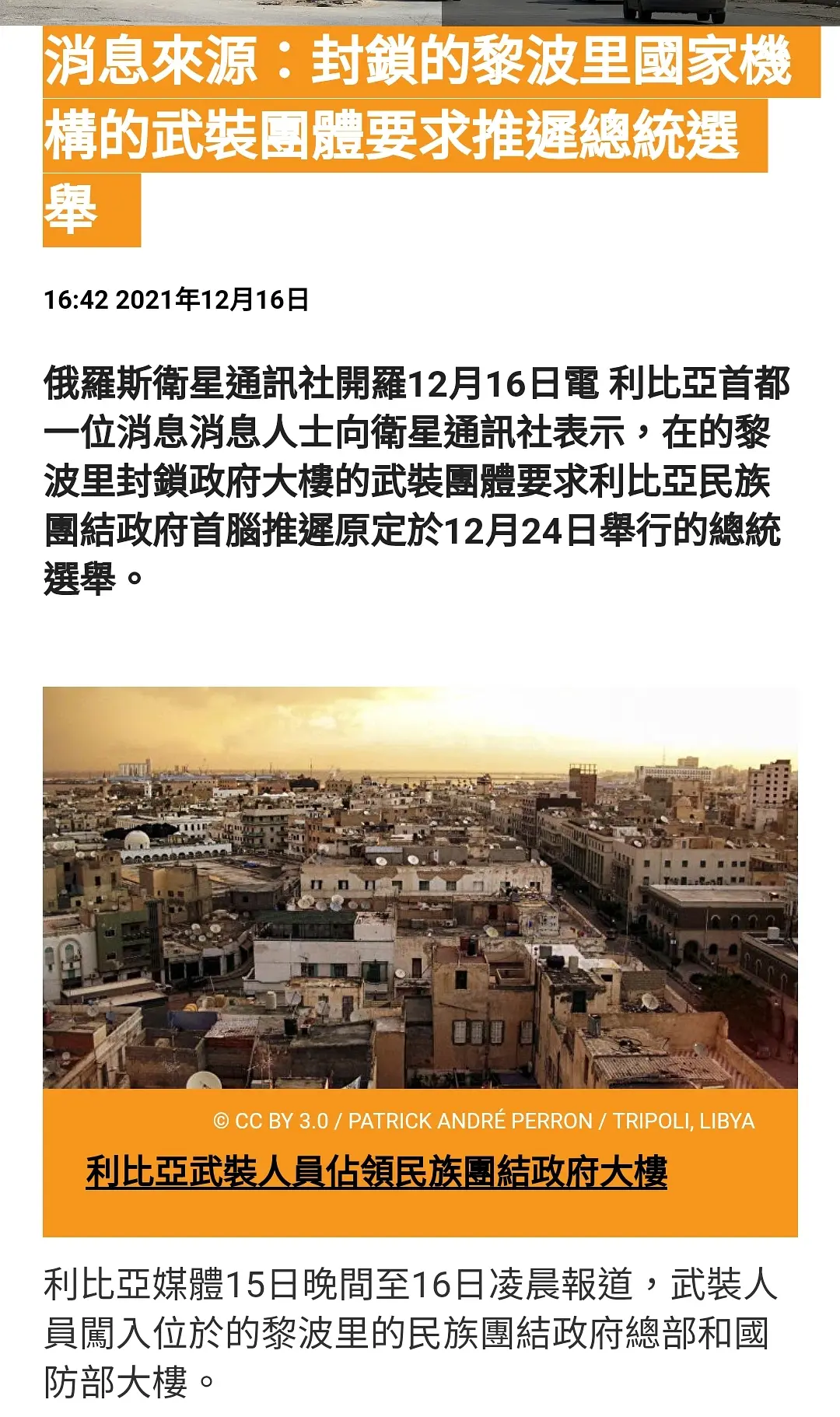 之前已经多次对大选表示过不满的米苏拉塔民冰在12月15日发动冰变,直接把的黎波里的民族团结政府(西部政府)一锅端了。本来利比亚是12月24号举行大选,这下应该举行不成了。东部政府的实际领导哈夫塔之前已经报名参与选举,而且赢的可能性还不小。